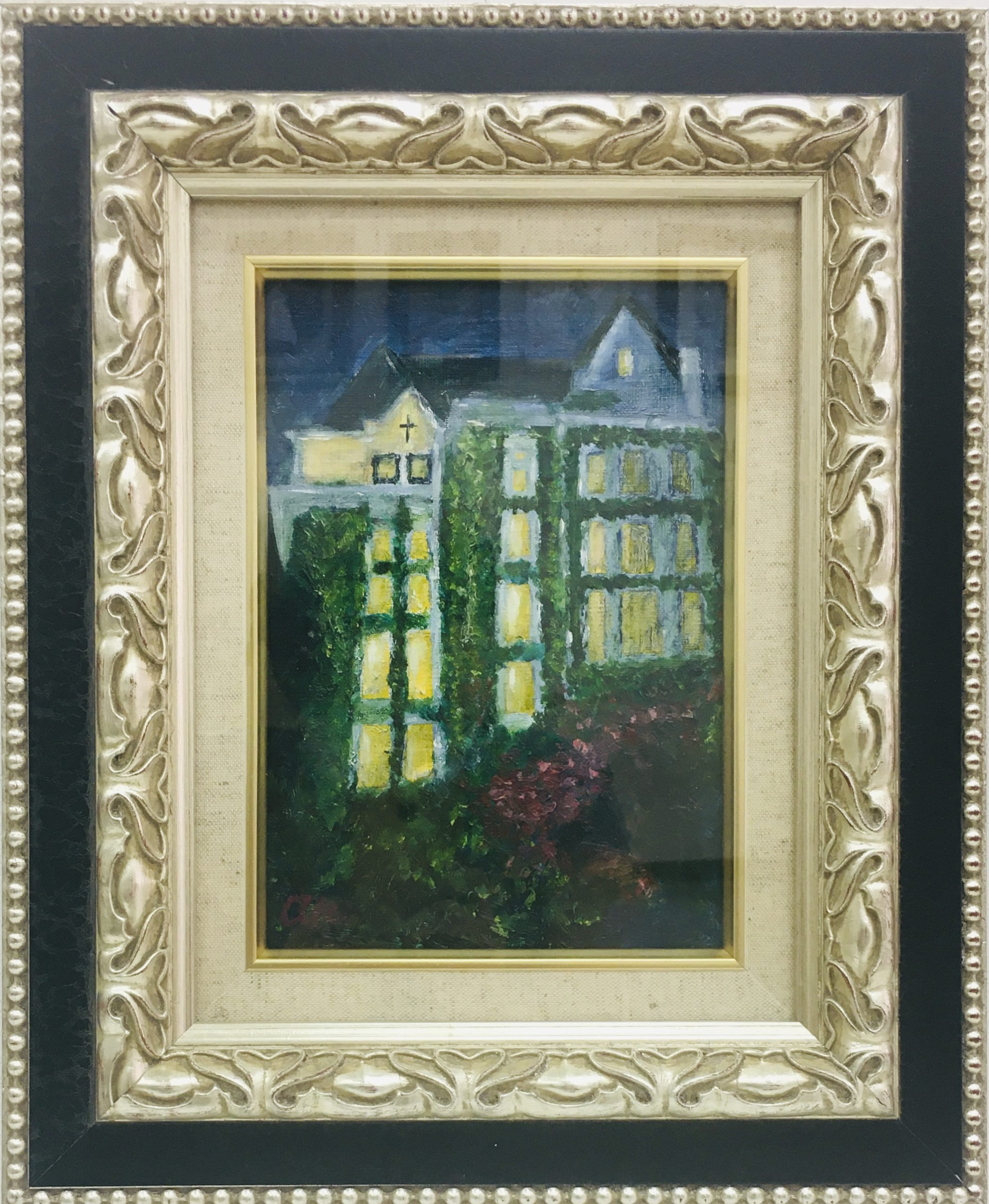例年ななく暖かい11月ですが、雨と共にそろそろ寒気が入り季節感が出てきそうなですね。さて、クリスマスの雰囲気が漂う蔦の絡まる夜景が出来あがりました。カナダビクトリアのフェアモントエンプレス外観を描いた油絵です。病棟医長さんの作品です。